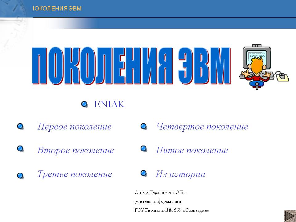 Данная презентация по информатике за 8 класс расскажет ученикам о поколениях ЭВМ, о первых компьютерах (электронных машинах). Говорится о 1-ой вычислительной электронно-цифровой машине, построенной в США - Eniak. Рассказывается об устройствах первого поколения машин: УВВ, АЛУ, ЗУ, УУ, а также показывается структура Фон Неймана. Говорится и о первых носителях информации - перфокартах, магнитные ленты, перфоленты. Рассказывается о компьютерах, построенных на основе ламп и микросхем.