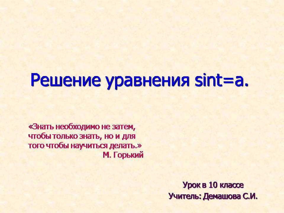Презентация по математике 10-11 класс: Решение уравнения с синусом, арксинус