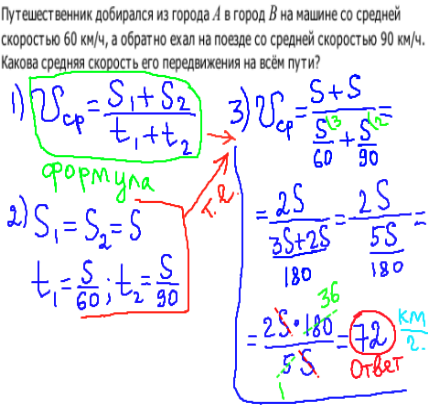 Задача ЕГЭ по математике 2014 решается легко, достаточно вспомнить формулу средней скорости. Затем выражаем S1=S2=S, т.к. путь в обе стороны одинаков. Находим первое и второе время t1=S/60, t2=S/90. Потом подставляем эти значения в формулу средней скорости и получаем ответ 72 км/ч.