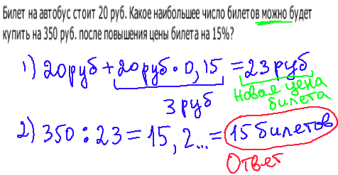 Простая задача на проценты - из группы заданий ЕГЭ B1. Вначале мы найдем новую цену за 1 билет, т.е. прибавим к первоначальной цене еще 15%, 20+20*15%=23 рубля. Далее посчитаем количество билетов, которые можно купить на 350 рублей, т.е. 350:23=15 билетов.