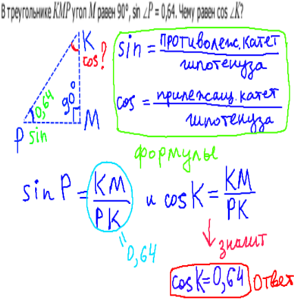 Геометрическая задача ЕГЭ 2014 по математике под номером B6, в которой известен синус одного острого угла треугольника и нужно найти косинус другого угла. Здесь мы вспоминаем определения понятий синуса и косинуса, их формулы. По этим формулам составляем выражения для синуса угла P и косинуса угла K, которые совпадают, значит cos угла K=0,64.
