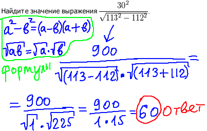 В задании егэ B7 на нахождение числового выражения, вы возводим число 30 в квадрат, а в знаменателе применяем формулу разности квадратов a2-b2=(a-b)(a+b). Извлекаем корень квадратный из 225, получим 900/(1*15)=60.