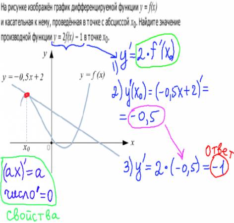 В этой задаче ЕГЭ B8 мы находим производную функции y=2*f(x)-1 -> y'=2*f'(x) и производную функции в точке x0 y=-0,5x+2 -> y'(x0)=-0,5. Затем подставляем число -0,5 в 1-ую функцию, получим ответ y'(0,5)=2*(-0,5)=-1.