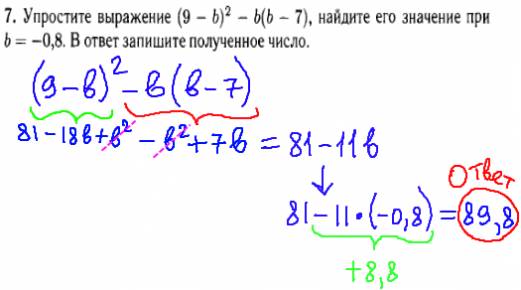 Эта задача по алгебре за 9 класс требует упростить буквенное выражение , а также найти его значение при b=-0,8. Вначале упростим (9-b)2 по формуле квадрата суммы (a-b)2 =a2 +2ab+b2 , получим 81-18b+b2 . Упростим теперь вторую часть выражения, получим -b2 +7b. В итоге получим 81-18b+b2 -b2 +7b=81-11b. Подставим вместо буквы b число -0,8: 81-11*(-0,8)=89,8. В ответе запишем число 89,8.