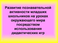 Цель презентации – показать, как в предмет окружающий мир влияет на формирование у учащихся собственного мировоззрения и восприятие окружающего мира. В качестве учебно-методического комплекта представлен учебник «Мир вокруг нас» Плешакова А.А., как не совсем удачное пособие для глубокого изучения материала. На слайдах четко прослеживается работа педагога, направленная на повышение познавательной активности детей на уроках окружающего мира и игра, используемая на каждом уроке, как основной способ достижения этой цели. На слайдах можно увидеть виды игры и дидактический материал, которым пользуется учитель.