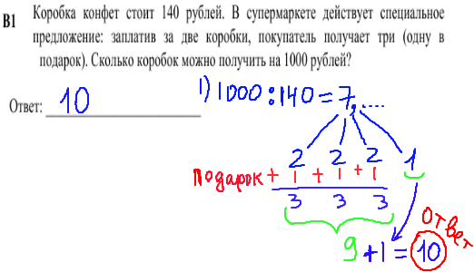 Задача ЕГЭ B1 не совсем стандартна. В ней мы сперва делим 1000 на 140, получим 7,....т,е. 2+2+2+1 или 3+3+3+1=10 (будет везде по 3, т.к. при покупке 2-х коробок - одна в подарок).