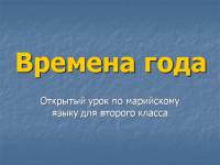 Каждому времени года посвящен отдельный слайд. На слайде в тематике каждого времени года расположена наглядная иллюстрация, небольшое стихотворение и название времени года на русском языке и на марийском. Презентация рассчитана на учащихся 1-4 классов, скачайте ее бесплатно.