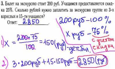 Для решения данной задачи гиа по математике из модуля "реальная математика" мы составляем пропорцию, где 200 рублей примем за 100%, а 75% (100%-25%=75%) за x - цена детского билета. Находим x путем перемножения по диагонали двух чисел и делением на третье число, получим 150 рублей. Потом считаем сумму взрослых и детских билетов, просто подставляем цены на взрослый и детский билеты. В ответе получим 2850 рублей.