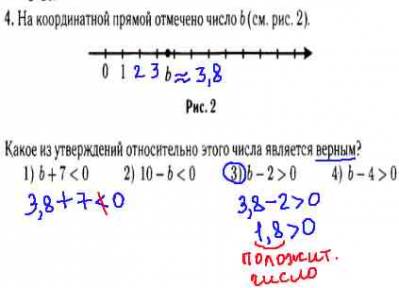 Решая данную задачу ГИА по математике , смотрим на луч и присваиваем букве b примерно число 3,8 (хотя можно взять и 3,5). Затем подставляем это число в каждое неравенство. Нам подойдёт 3-ее неравенство , т.к. 3,8-2>0, действительно 1,8>0. Можно было даже не считать, а сразу догадаться, что получится положительное число, которое больше нуля.