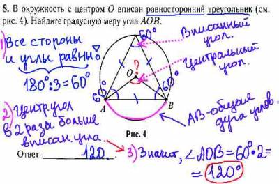 Данное задание гиа по математике из модуля "Геометрия" решается легко. Нужно знать, что углы в равностороннем треугольнике равны по 60 градусов (т.к. 180:3=60 градусов). И второе - нужно знать, что центральный угол окуржности в 2 раза больше вписанного, значит он равен 120 градусов.
