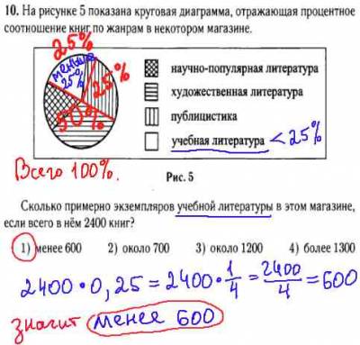 При решении данной задачи ГИА по математике из модуля "Реальная математика" , мы делим весь круг (100%) на части по 50% или по 25%, т.е. либо пополам, либо на четверти. По диаграмме видно, что учебной литературы (белый цвет) менее 25%, т.е. 2400 книг*0,25=600 книг, значит было менее 600 книг.