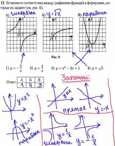 При решении данного задания гиа по математике 2013 года, мы должны запомнить основные виды графиков функций, их формулы: парабола, прямая, гипербола, кубическая парабола, и корень квадратный из x. В ответе пишем: A-1; Б-4; В-3.