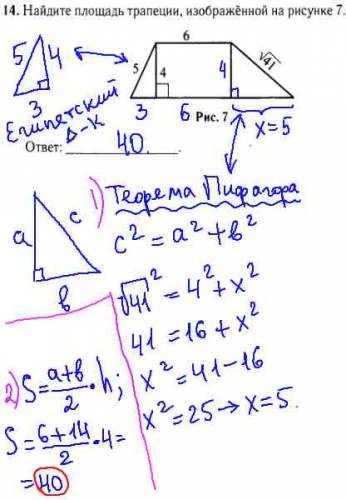 При решении данного задания по математике и подготовке к ГИА по модулю "Геометрия" мы воспользовались "Теоремой Пифагора", и нашли x=5. Затем, применяя формулу для нахождения площади трапеции, находим S=40.