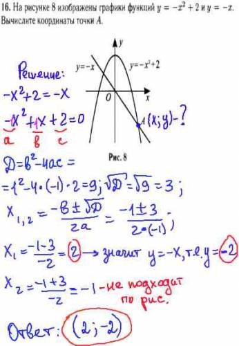 В решении задания ГИА по математике 2013 из модуля "Алгебра" мы вначале приравниваем функции и решаем полученное квадратное уравнение по дискриминанту. Затем находим координату x=2 согласно рисунку, и подставив это число в любую функцию находим y=-2. Ответ: (2;-2).