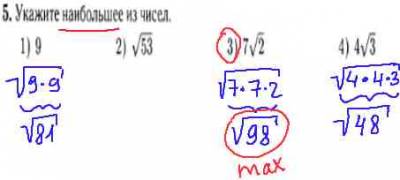 В ходе разбора и решения данного задания ГИА по математике за 9 класс (из модуля "Алгебра") , мы должны вспомнить свойство квадратного корня. Согласно свойству, число перед квадратным корнем мы может занести 2 раза под корень с умножением. В итоге, получим,что 7*корень из 2=корень (7*7*2)=корень из 98, которое и будет наибольшим числом.