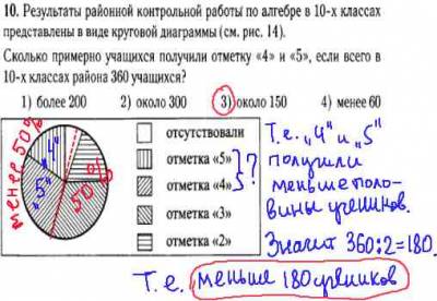 Произведем разбор задания ГИА по математике из модуля "Реальная математика". Нам представлена круговая диаграмма, которую сразу советую делить на 2 или 4 равные части, т.е. по 50% или по 25%. В данном случае, нам удобно поделить диаграмму на 2 равные части по 50%, т.к. оценки "4" и "5" составляют чуть меньше половины круга. Отсюда весь круг 360 делим на 2 и получаем 180 учеников, значит ответ: чуть менее 180 учеников.