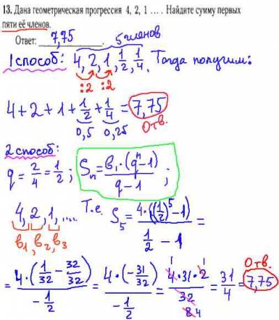 При решении задачи по математике и подготовке к ГИА 2013, советую знать 2 способа решения задачи. В 1-ом способе решения, вам нужно узнать лишь знаменатель прогрессии q, который находим делением последующего члена на предыдущий, например, q=1:2=1/2. Значит получается, что каждый следующий член получается делением на 2, их легко угадать: 1/2, 1/4. Затем просто складываем все члены прогрессии и получим ответ 7,75. Во втором способе нужно знать формулу суммы n первых членов геометрической прогрессии S(n), где n-это количество членов прогрессии. Данной формулой есть смысл пользоваться,лишь при большом количестве членов геометрической прогрессии.