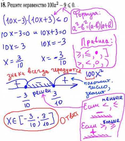 Прорешаем свежее задание ГИА по математике 9 класса из модуля "Алгебра", необходимое для качественной подготовки к ГИА по математике 2013. Для решение квадратного неравенства, мы вспоминаем формулу разности квадратов, и раскладываем выражение на 2 скобки. Приравниваем каждую скобку к нулю, находи x1=3/10 и x2=-3/10. Затем отмечаем данные корни на числовом луче, получаем 3 промежутка. Чередовать знаки справа налево начинаем с +, т.к. перед x^2 стоит положительное число 100. Заштриховываем с минусом, т.к. знак <=. Ответ: [-3/10;3/10].