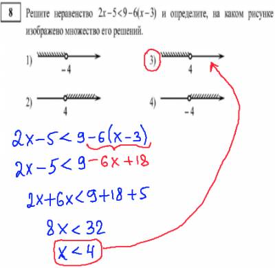 В 8 задании ГИА из реального варианта 2013 года - решаем обычное линейное уравнение, получим x<4 - т.е. это 3-ий вариант ответа.