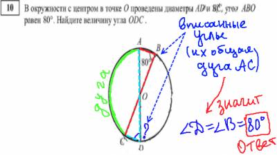 В десятом задании по геометрии, мы смотрим на 2 вписанных угла B и D, которые будут равны по 80 градусов, т.к. опираются на одну общую дугу окружности.