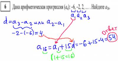 В задаче ГИА на арифметическую прогрессию сперва, как обычно, находим разность d=-2-(-6)=4 (из последующего члена вычитаем предыдущий). По формуле находим a16=a1+15d=54.