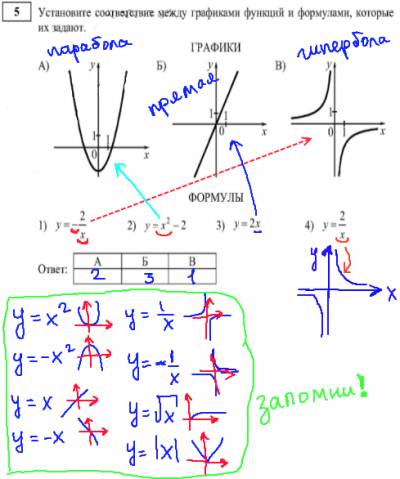 В пятом задании ГИА из модуля "Алгебра" на соответствие графиков функций и формул, нужно вспомнить их обозначения. Советую обращать внимание на переменную x.