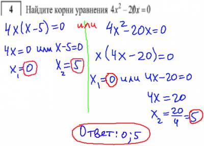 В четвертом задании по математике 9 класса - выносим за скобку общий множитель (можно 2-мя разными способами), приравниваем к нулю и находим 2 корня квадратного уравнения: 0 и 5.