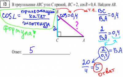 В двенадцатом задании ГИА по математике, используя формулу косинуса и катет прямоугольного треугольника, находим гипотенузу AB равную 5.