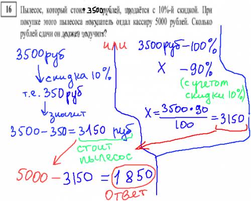 В 16 задаче ГИА на проценты находим 10% от 3500 рублей - это 35 рублей, получим 3465 рублей - стоимость пылесоса со скидкой. Получается 5000-3465=1535 рублей - сдача.