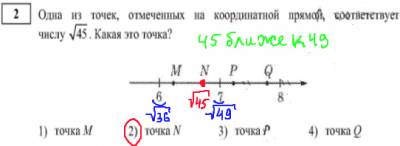 В этом задании ГИА из реального варианта, смотрим на координатный луч: 6 превращаем в ?36 (т.к. 6*6=36), 7 в ?49. Значит ?45 ближе к ?49, т.е. ответ: 2)точка N.