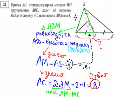 В последней решенной задаче ГИА по математике из реального варианта 2013 года под номером №24 (модуль геометрия, 2 часть), вначале мы убеждаемся, что треугольник ABM - равнобедренный, т.к. высота AD одновременно является и медианой (т.к. BD=DM). Следовательно, AM=AB=4. Таким образом, отрезок AC=2*AM=2*4=8, либо AM+MC, получится 4+4=8.