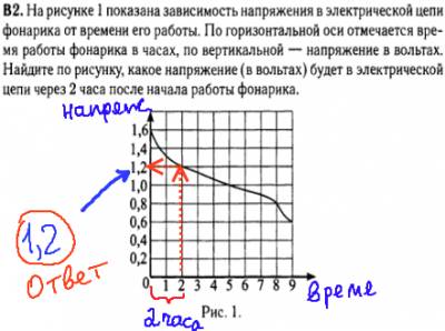 При решении (разборе) данной задачи ЕГЭ по математике 2013 года, нужно внимательно прочитать вопрос задания и посмотреть на график реальной зависимости. По рисунку и видно, что через 2 часа напряжение станет 1,2 Вольт.