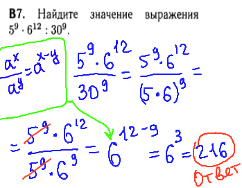 Рассмотрим разбор задачи ЕГЭ по математике под номером B7. Решение задания ЕГЭ обязательно поможет ученикам 11 класса в подготовке к экзамену ЕГЭ по математике 2013 года. В задании нужно найти значение выражения, в частности, сократить дробь со степенями. Вначале раскладываем 30 как 5*6 в 9 степени. Затем сокращаем 5 в 9 степени. Потом применяем правило: при умножении одинаковых оснований - степени складываем, при делени - вычитаем. У нас будет деление, поэтому вычитаем степени 12-9, получим 6^3=216.