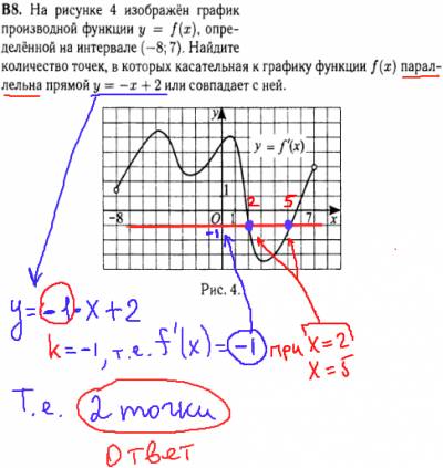 Посмотрим на решение задачи B8 из подготовительных вариантов ЕГЭ по математике. Данное задание ЕГЭ принадлежит к теме: "Производная функции, касательная". Решается просто, главное правило, если касательная параллельна или совпадает с прямой y, то коэффициент k будет такой же. У нас в задании у=-x+2, или y=-1*x+2, т.е. коэффициент k=-1 (число перед x). Значит коэффициент k касательной к графику y=f'(x) тоже равен -1. Чертим прямую линию y=-1 и видим, что она пересекает график в 2-х точках (x=2 и x=5). Ответ: 2 точки.