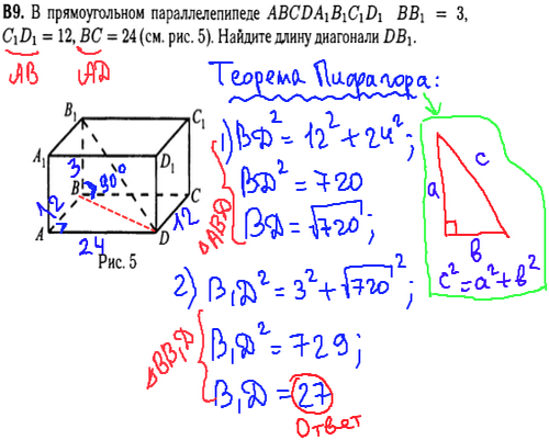 Разбор и решение задачи ЕГЭ по математике B9 очень пригодится выпускникам 11 класса при изучении стереометрии. В данной задаче B9 самое главное - это теорема Пифагора, формулировка: "В прямоугольном треугольнике квадрат гипотенузы равен сумме квадратов катетов". Сперва найдем гипотенузу BD в треугольнике ABD, а затем гипотенузу B1D - в треугольнике BB1D. Ответом будет: 27.