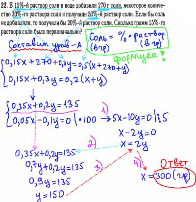 При решении данной задачи ГИА, главное помнить, что масса чистого вещества (соль в граммах) будет равна произведению концентрации (%) на массу раствора (в граммах). По условию мы составляем 2 уравнения и решаем полученную систему. Найдя переменную х - получим ответ 300 грамм.