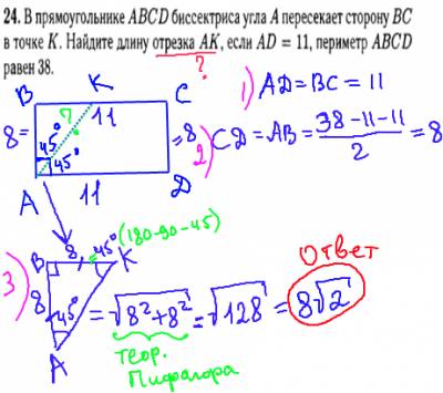В решении данной задачи, мы должны знать, что биссектриса делит угол пополам, таким образом, получим равнобедренный треугольник, углы при основании котрого равны по 45 градусов. К этому треугольнику применим теорему Пифагора, и найдем отрезок AK (гипотенуза) равный 8?2.