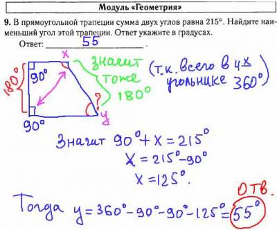 Решение задачи ГИА по математике, модуль "Геометрия" - найти наименьший угол прямоугольной трапеции