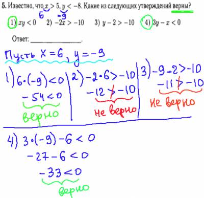 Эта задача требует указать верные утверждения, согласно неравенствам. Просто возьмем любое число большее 5, например 6, и число меньшее -8, например -9. Подставим эти числа во все 4 неравенства, посчитаем их и выберем верные.