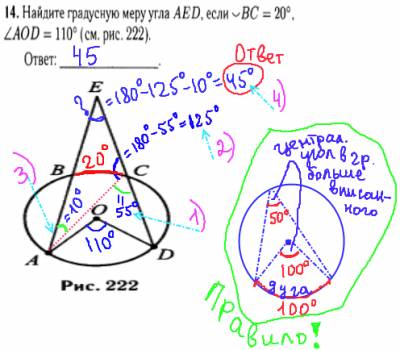 Здесь нужно вспомнить про то, что вписанный угол окружности в 2 раза меньше центрального угла (или дуги, на которую он опирается). Вначале проведем отрезок AC, и найдем вписанный угол ACD=110/2=55 градусов. Затем по свойству смежных углов найдем угол ACE=180-55=125. Также т.к. дуга BC=20 градусов, то вписанный угол BAC=20/2=10. Теперь рассмотрим треугольник AEC, в котором легко найти оставшийся 3-ий угол: 180-125-10=45 градусов.