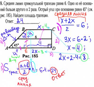 В этой геометрической задаче, нам нужно вспомнить. что средняя линия трапеции равна полусумме ее оснований. Исходя их этого, составляем уравнение и находим x=4, значит другое основание трапеции будет в 2 раза больше, т.е. 4*2=8. Потом проводим высоту в трапеции, смотрим на треугольник, он будет равнобедренным, т.к. 2 угла будут по 45 градусов - значит высота равна 4, как и другая сторона треугольника. Отсюда по формуле площади трапеции, найдем ответ = средняя линия*высоту=6*4=24.