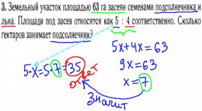 В данной задаче ГИА из модуля "Алгебра" мы составляем уравнение, складываем все части, т.е. 4x+5x - это и есть 63 га семян. Решив уравнение, получим что в одной части x содержится 7 га. Получается - подсолнечника было 5*7га=35 га.