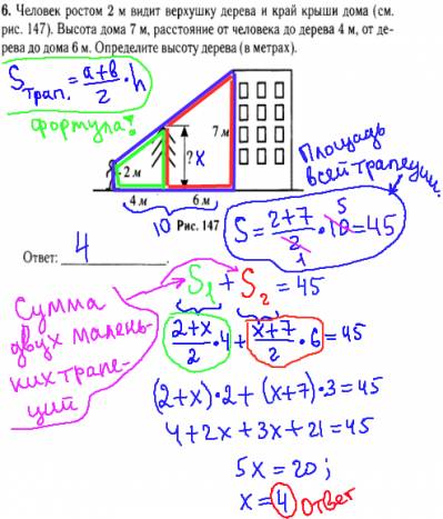 Интересная задача ГИА с подвохом. Многие ученики наверно подумали, что здесь надо составлять пропорцию как при подобии треугольников, но это не так! Оказывается, нужно вычислить площадь большей трапеции - равную 45, а за высоту можно принять неизвестную переменную x. Затем, составить уравнение, сложив площади меньших трапеций и приравняв к 45. Решив данное уравнение, мы получим высоту дерева x=4 метрам.