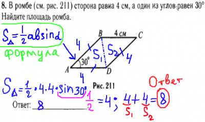 В следующем разборе задачи ГИА по геометрии надо найти площадь ромба. Поделим ромб на 2 равных треугольника, найдем площадь одного из них по формуле с синусом угла между сторонами. Затем, сложим две равные площади треугольников и получим площадь ромба равную 8.
