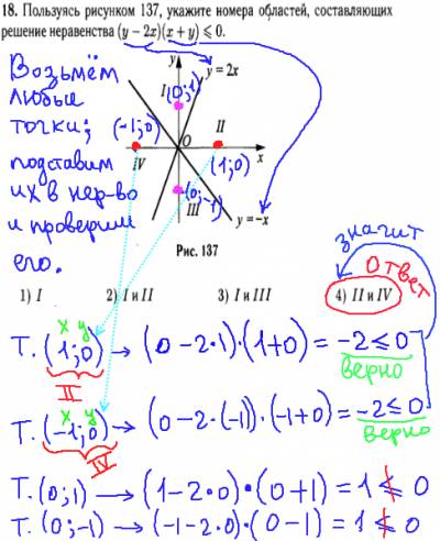 И последнее решение задания ГИА 2013 из модуля Алгебра - в нем по рисунку нужно определить области, удовлетворяющие неравенству. Советую просто взять 4 любых точки, и подставить их в данное неравенство, тем самым проверяя его. Точки, при которых неравенство будет верно, укажут нам на нужные области.