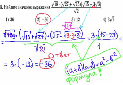 В этом задании ГИА по математике нам нужно вычислить дробно-рациональное выржение, применив формулу разности квадратов к числителю. Также не забываем, что 3?3=?3*3*3=?27. В ответе получим -36.