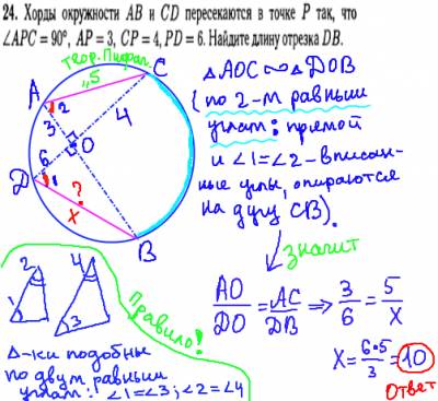 Решая задачу, мы построили в окружности 2 треугольника, которые оказались подобны по двум равным углам (углы 1 и 2, и прямые углы). Затем составили пропорцию, и нашли неизвестную сторону (хорду) DB равную 10.