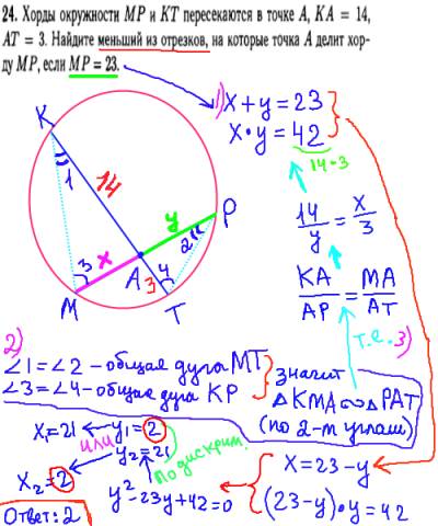 В данной геометрической задаче, мы построил 2 треугольника в окружности, которые оказались подобны по двум углам: равные вписанные углы 1 и 2 (опираются на дугу MT), 3 и 4 (опираются на дугу KP). Из этого подобия, мы составляем пропорцию и находим что x*y=14*3; также по условию задачи известно, что x+y=23. Таким образом, решаем систему уравнений, в которой будет 2 решения: x1=21; y1=2 или x2=2; y2=21. В итоге, меньший из отрезков все равно будет равен 2.