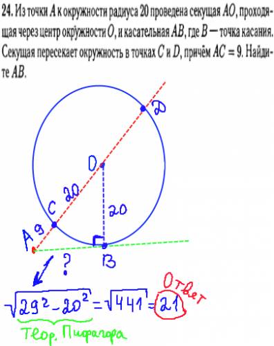 Основная мысль геометрической задачи в том, что касательная всегда перпендикулярна радиусу окружности, т.е. AB?OB, значит треугольник AOB прямоугольный и по теореме Пифагора легко найти сторону AB, равную 21.