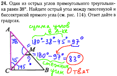 При решении геометрической задачи сразу делим прямой угол C на 2 равных по 45 градуса (т.к. CM - биссектриса). Отсюда, рассматривая треугольник ACM, легко найти угол M=180-38-45=97 (т.к. сумма всех углов в нем равна 180 градусов). Далее из свойства двух смежных углов (их сумма равна 180 градусов), найдем искомый угол CMB: 180-97=83 градуса.